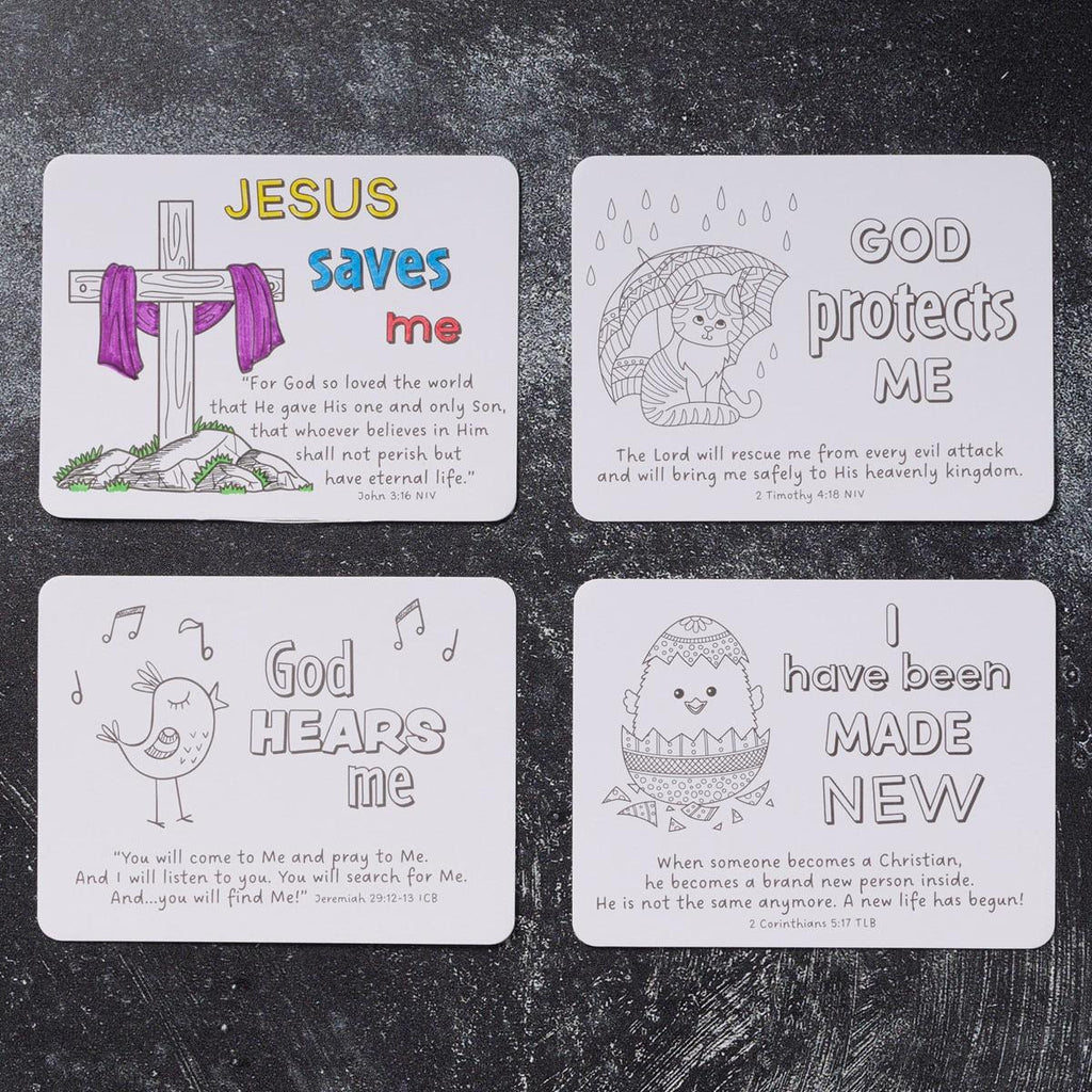 The box contains 44 cards made from heavy cardstock. Each card features a heartwarming, biblically based affirmation showing children that they are loved, forgiven, saved, chosen, and strengthened by Jesus. These affirmations are supported by uplifting Scripture verses and paired with a fun line-art illustration, ready to be colored. The backs are intentionally left blank for children to add their own insights or drawings.