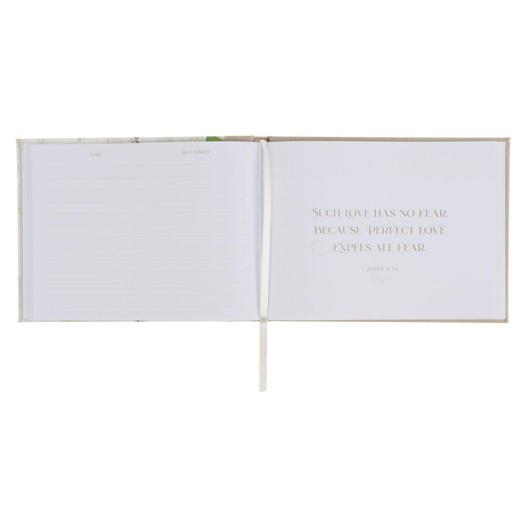 Capture every special moment with the Love Ivory Faux Leather Medium Guest Book, featuring 160 lined pages, Scripture verses, and elegant floral design.