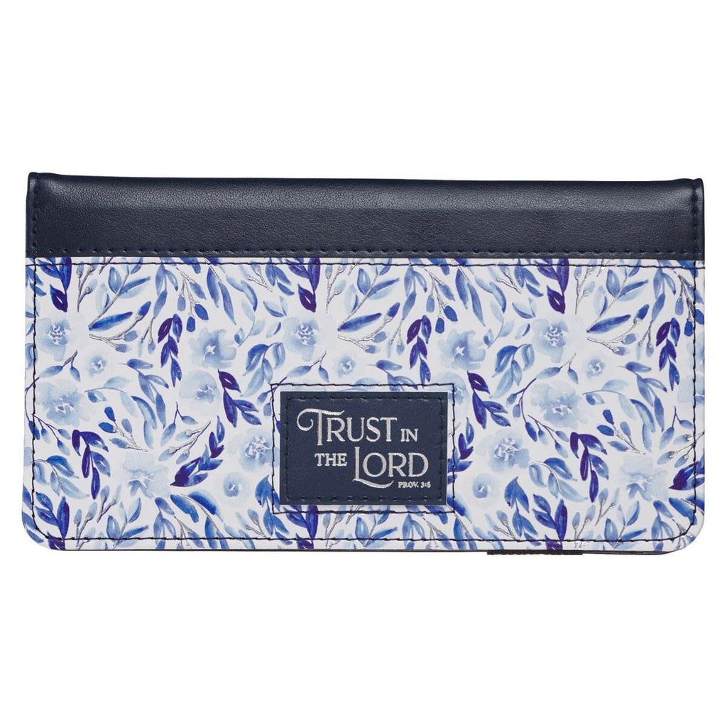 The Trust in the Lord Blue Botany Faux Leather Checkbook Wallet is part of the Trust in the Lord Blue Botany Collection, which includes a tote bag, a 40-ounce stainless steel tumbler, a faux leather Bible cover, a faux leather checkbook cover, and a faux leather bookmark.