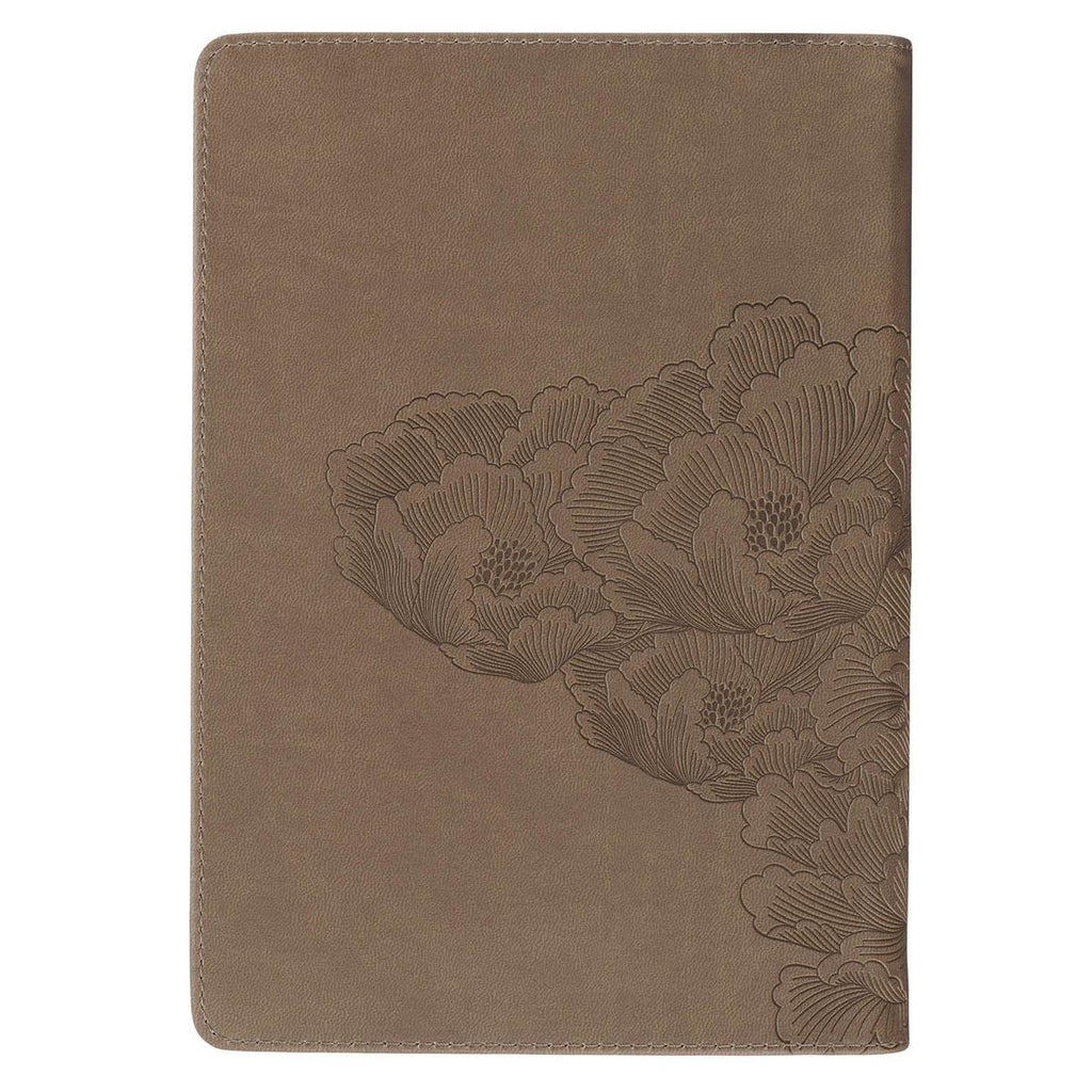 The ash-brown faux leather cover is elegantly heat-debossed with a cascading floral design that wraps from front to back. A heat-debossed frame on the front showcases the gold-foiled verse from Joshua 1:9 in a multi-font design.