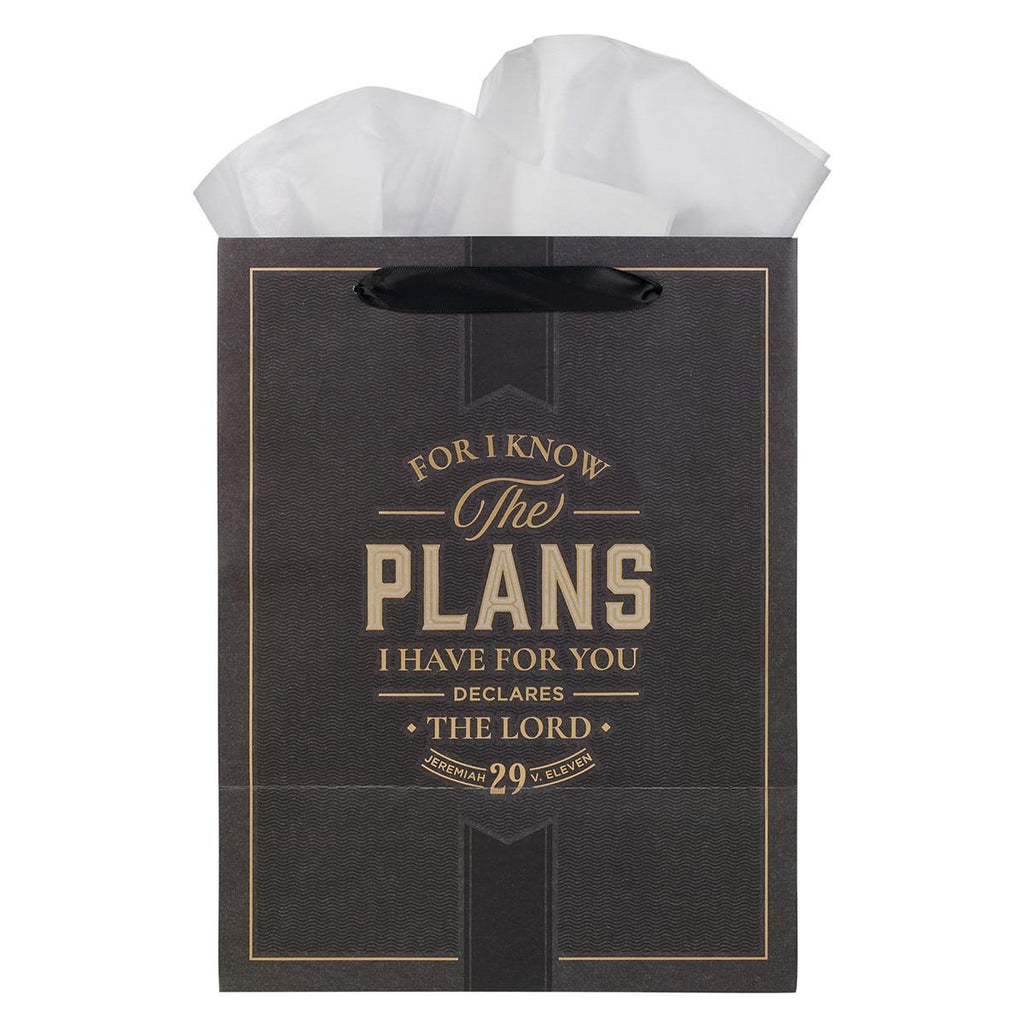 Graduating high school or college is a momentous occasion in a young adult's life, so mark it with The Plans Charcoal and Gold Large Portrait Gift Bag. Wrapping your gift in this inspirational gift bag is a meaningful and stylish way to honor a graduate's achievement while pointing him to God's promise for his future.