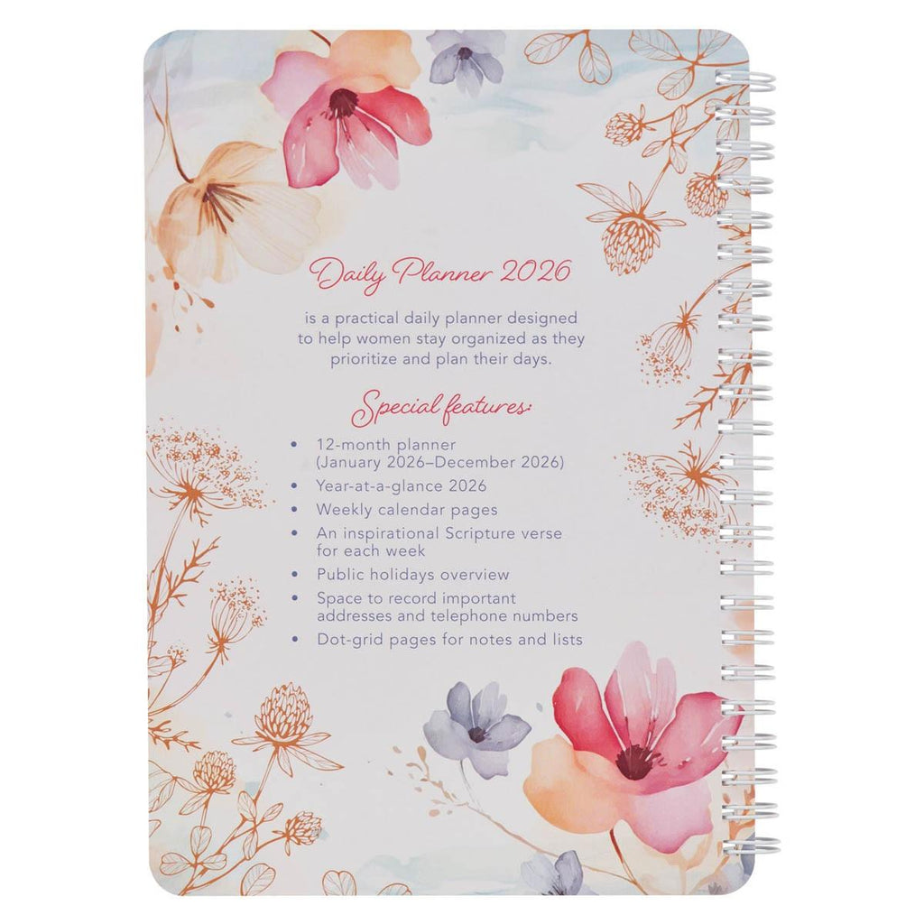 A peaceful illustration of coral, pink, and periwinkle watercolored flowers is accented with whimsical gold-foiled flower outlines on the covers of the planner. In the center of the design, the year is printed in purple above the Scripture sentiment, written in coral and periwinkle font.