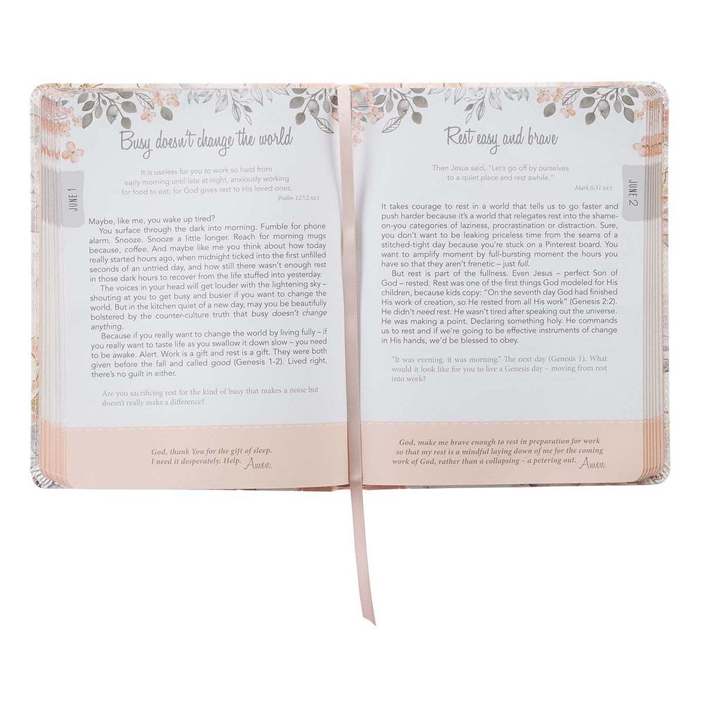 Walking in Grace is a daily devotional and a haven of calm contemplation amid the busyness of life, providing courage, hope, and wisdom. Inside are 366 devotions, each including a Scripture verse, a challenge for the day, and a prayer. The supple salmon pink faux leather cover is decorated with an elegant flower blossom design, and the title and page edges are accented in rose gold foil. The full-color interior pages are decorated with a similar floral motive. An attached silk ribbon marker is included to keep your place.
