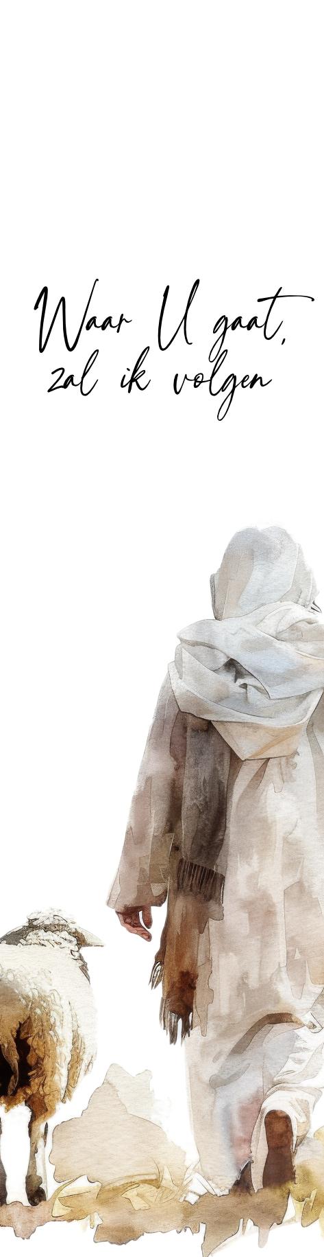 Deze stijlvolle boekenlegger is gemaakt van echt, hoogwaardig Nederlands leer en meet 4 x 15 cm. Het witte leer vormt een mooi contrast met de gedetailleerde bedrukking van een herder en schaap, als subtiele verwijzing naar toewijding en vertrouwen. De inspirerende tekst œWaar U gaat zal ik volgen  maakt dit accessoire tot een waardevol cadeau of persoonlijke herinnering. Afgewerkt met een stevig kunstleren koord, is deze boekenlegger niet alleen praktisch, maar ook een visueel statement in elk boek. Een bijzonder product met een hartverwarmende boodschap.