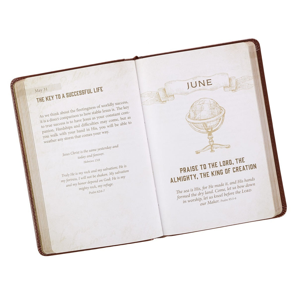 A presentation page that you can complete to address the devotional to a friend or family member can be found in the front of the book. The content is ordered by month and follows a perpetual calendar year that allows you to cycle through the book year after year. Each daily entry starts with a short devotional thought followed by several supporting Scripture verses. The hope is that meditating on these verses will spark a fire to study the Bible.