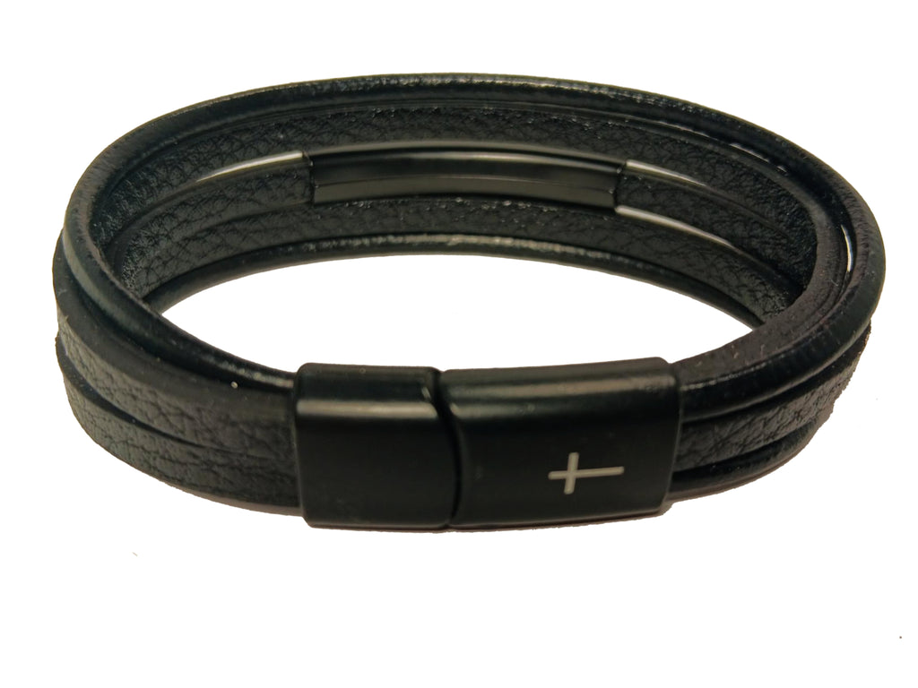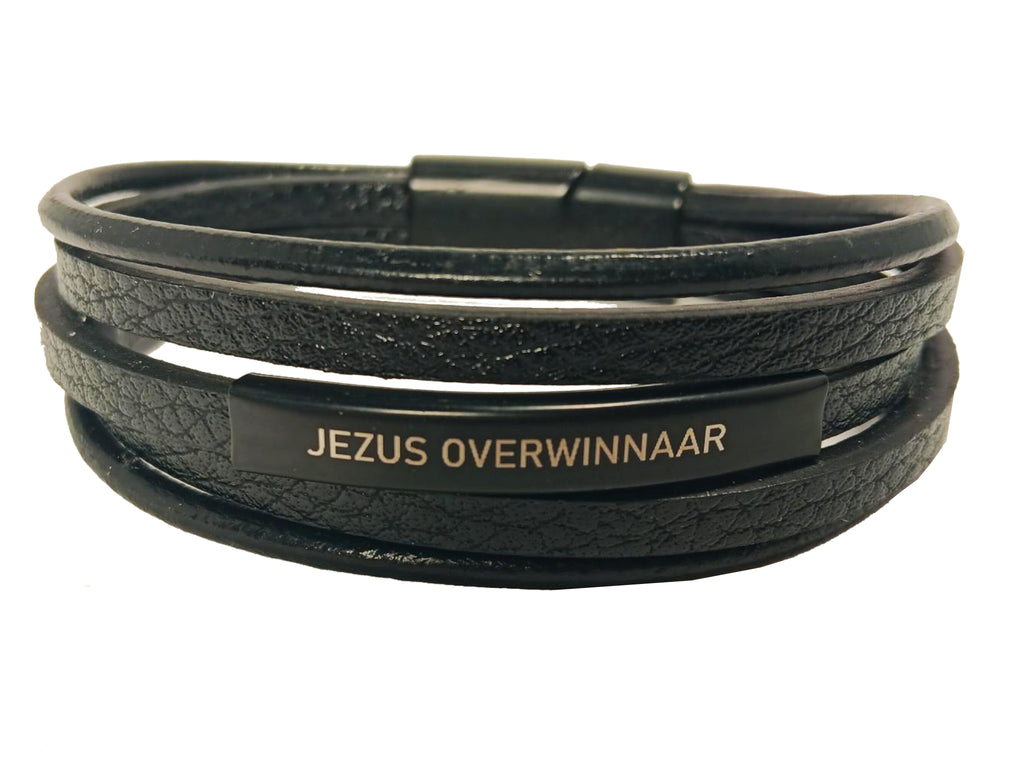 Deze stijlvolle zwarte leren armband heeft de tekst 'Jezus overwinnaar' en een gegraveerd kruisje op de sluiting. De armband is gemaakt van echt leer en combineert duurzaamheid met een mooi ontwerp. Deze armband is met liefde gedrukt in Nederland en is perfect om dagelijks te dragen.