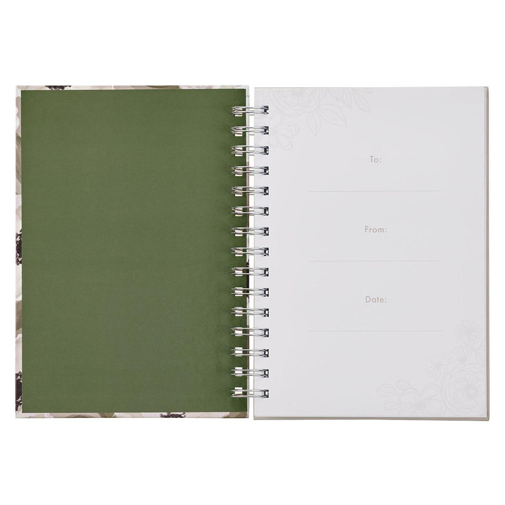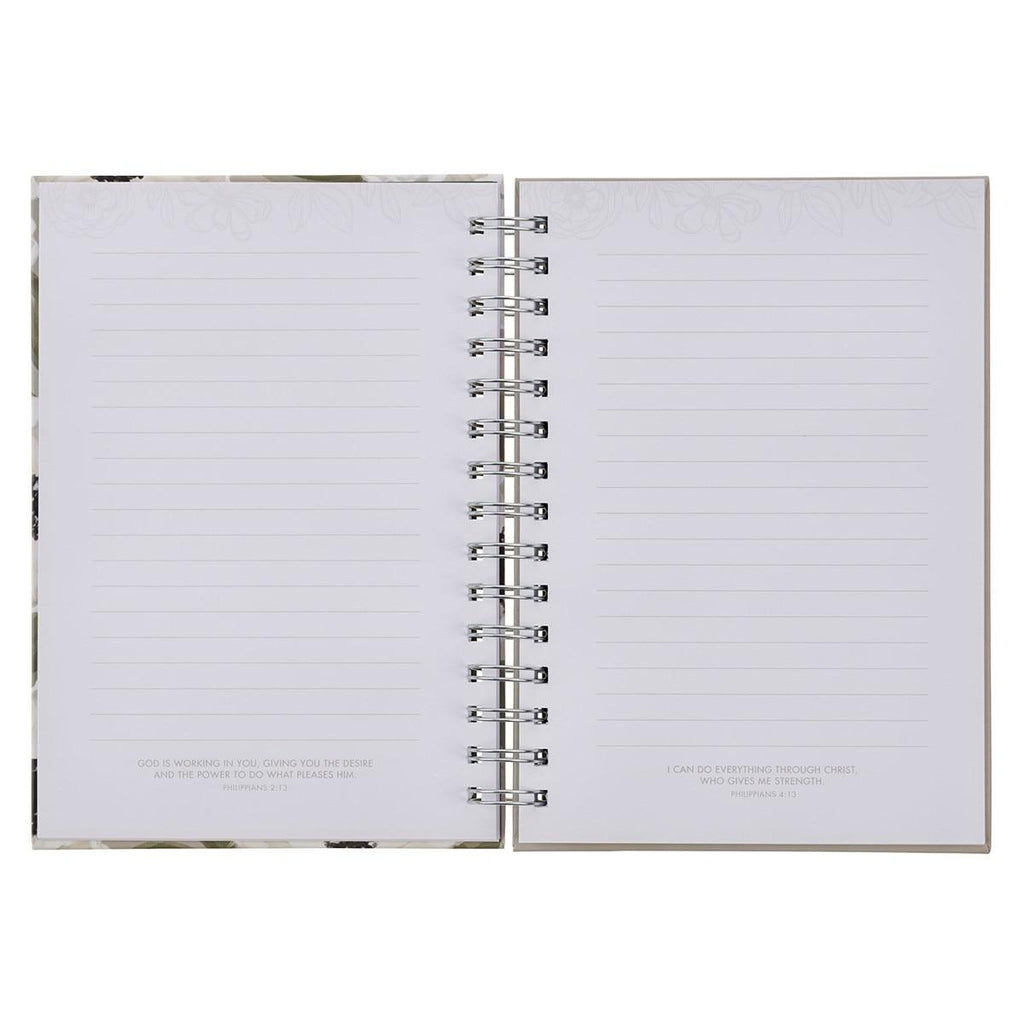 The soft gray cover of the Christian spiral journal is scattered with white florals and green foliage that frame the uplifting white hand-lettered sentiment.