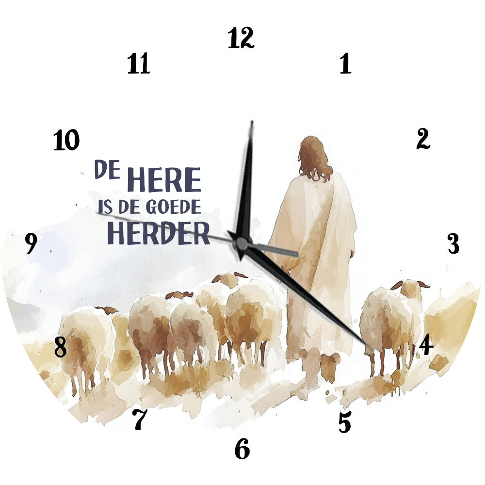 Op de wijzerplaat staat de tekst De Here is de goede herder, gecombineerd met een afbeelding van de Herder die over zijn schapen waakt.
