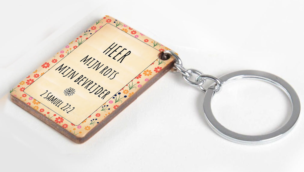 Houten sleutelhanger bedrukt met vrolijk motief.