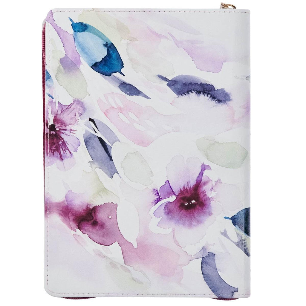 The Trust in the Lord Plum Floral Faux Leather Classic Journal with Zipper Closure is part of the Purple Bloom Like the Flowers Collection with artwork by Stephanie Ryan. This collection includes a note block with pen, a faux leather luggage tag, a magnetic notepad with pen, a magnetic bookmark set, two ceramic coffee mugs, a gift pen, a spiral journal, a large notebook set, a classic zippered faux leather journal, a stainless steel water bottle, and a gift bag.