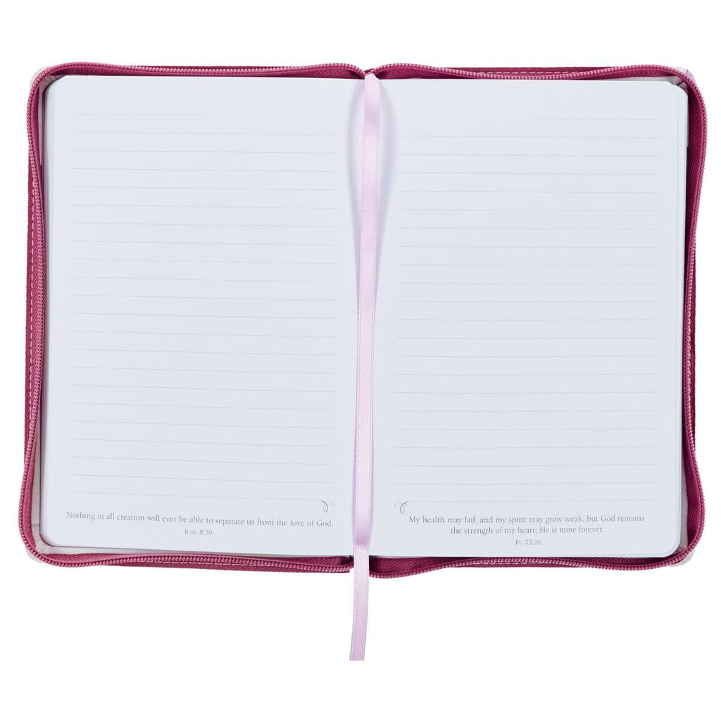 A zipper closure with a gold metal zipper pull securely closes the covers of the journal, and a satin ribbon marker is included to quickly find the page you are journaling on. The journal includes a presentation page to inscribe with a message when it is given as a gift. Inside the journal, 336 lined pages feature a Scripture verse that can be used as a journal or prayer prompt.