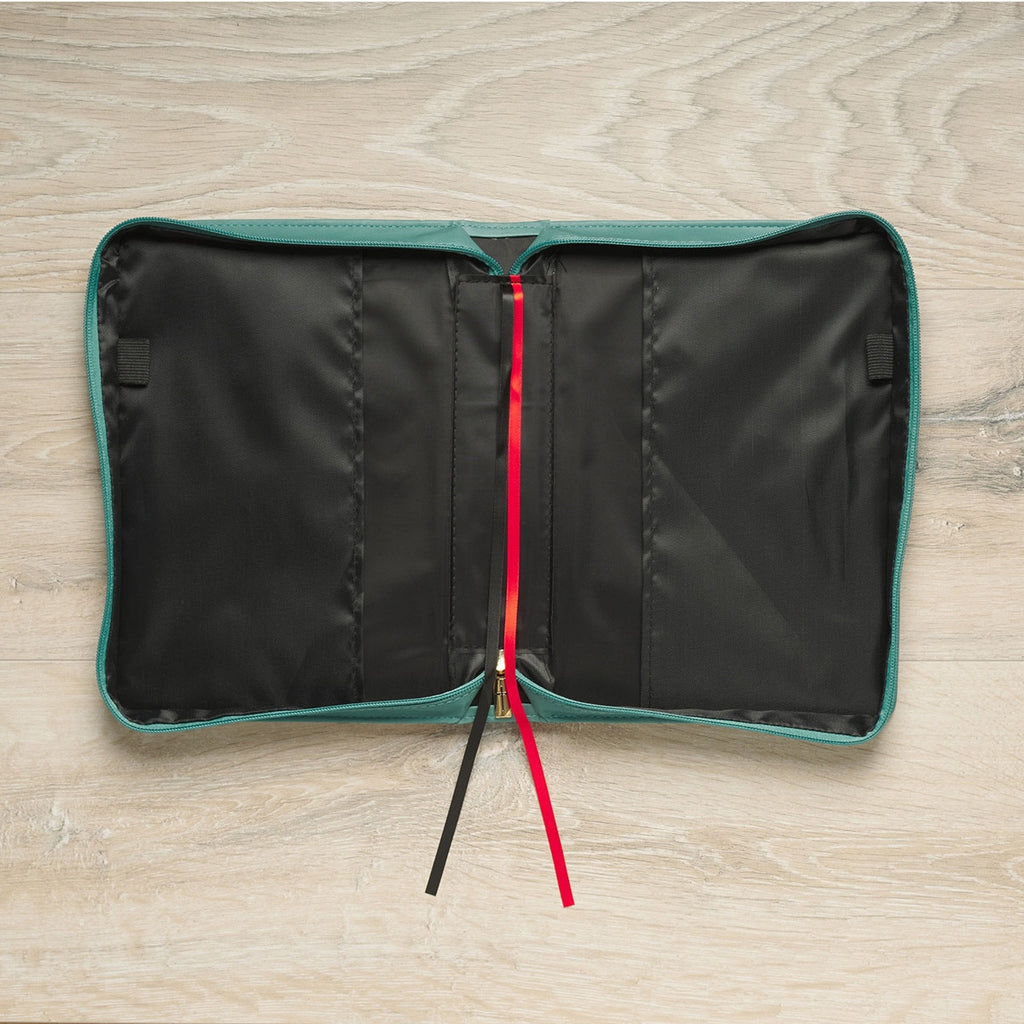 A handy slip pocket on the back panel is ideal for holding your bulletin or Bible study materials. Topstitching along the edges of the Bible case reinforces the construction. The spine features a teal faux leather lay-flat handle attached with gold metal hardware for easy carrying, complemented by an engraved gold metal zipper pull that securely closes the covers.