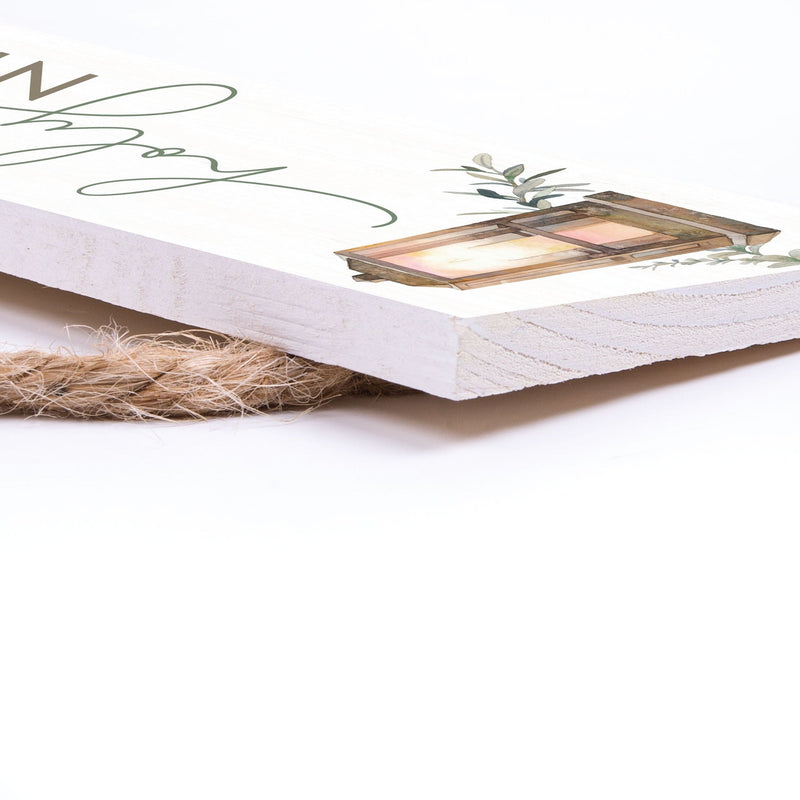 Christmas decor hanging sign features pine slat on jute string. Lantern art with leaf motif and sentiment.